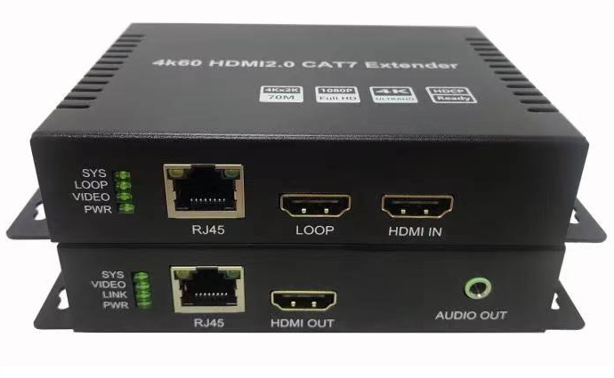 HDMI2.0 Extender over CAT6 or CAT6A/7 extends 4K 60Hz 4:4:4 HDMI 2.0 signals to remote places, point-to-point transmission mode supports transmitter 1 channel HDMI2.0 input and 1 channel loop,Receiver 1 channel HDMI2.0 output and 1 channel audio output. It can extend HDMI 2.0 video signals up to 70 meters and transmit them over CAT6 cables at 4K 60Hz resolution. High bandwidth, no latency, remote playback of real-time HD video. It is widely used in computing and surveillance systems, big screen advertisement system, video wall, bank, stock market, education system etc.