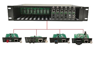 ?A maximum of 16 media converters modules can be inserted into the rack at the same time. Each media converter module can be of different models